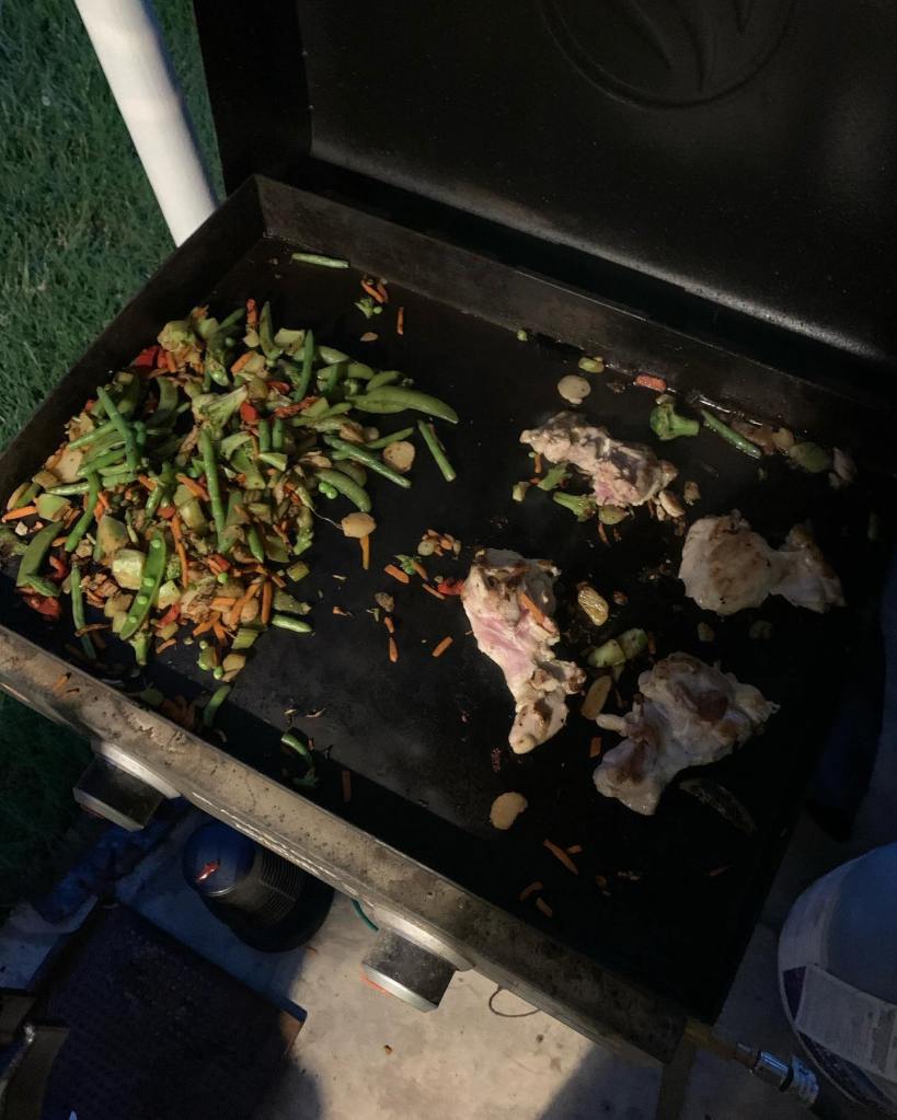 Go out to your Blackstone griddle and dump 2 bags of the sitry fry veggie mixes. Cook until tender. Place 4 chicken thighs on the griddle. Cook until you have an internal temperature 170 degrees. When that step is done. Head inside and boil water in a pot, then flash boil the brown rice noodles. Chop up the chicken thighs into chunks. Throw the veggies, chicken, noodles, and teriyaki sauce into a sauce pan. Cook until the sauce starts to bubble.